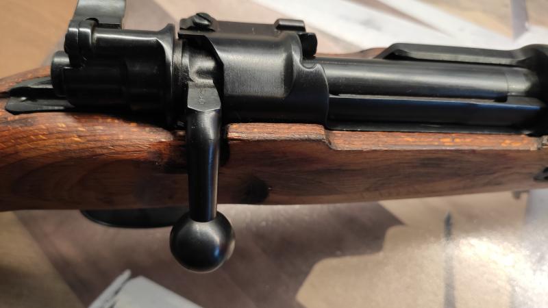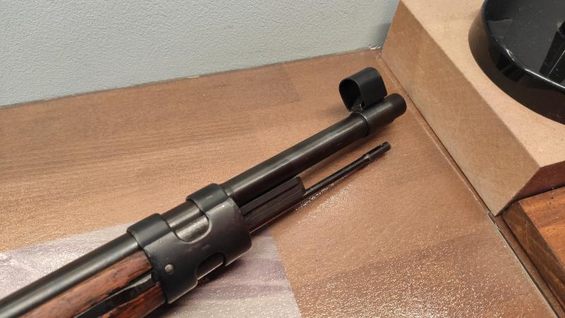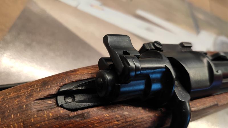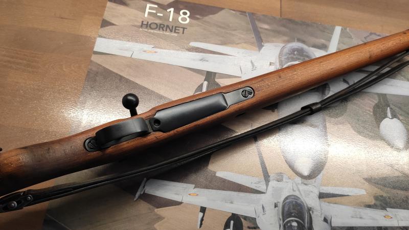 Casi 2 años después pero..por fin encontré un armero de confianza que me lo dejó como quería. Las maderas finalmente las dejamos como estaban, solo nos centramos en retirar las marcas del lápiz eléctrico. Esto que supuso pulir y re-pavonar, lo más parecido al resto: el cerrojo completo con la aleta del seguro y la tapa inferior del depósito de munición. También pulir al aceite la cantonera (parece que brilla mucho pero es por la luz y la foto en realidad ha quedado mate), que en realidad debería ir pavonada en negro según la época pero como siempre lo ha tenido así este rifle lo he querido dejar, al menos por el momento, así como esta, con el acero visto. Aproveché para ponerle el cubrepunto, que lo tenía pero no disponía de herramientas para colocarlo.