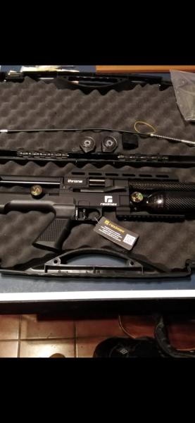 Saludos buena gente del foro. un buen amigo mio vende una carabina Retimex Throne, calibre 5,5 de 24 julios. La compro para su hijo y apenas ha llegado a usarla, esta completamente nueva.Funciona a 200 bares , tiene un cañon del 22 de 58 centimetros, se puede regular tanto la presion del manometro como la regulación de la potencia.Va con dos cargadores de 12 disparos del 5,5. Se puede configuar tambien en calibre 4,5 y 6,35 comprando cañon y cargador saliendo cada juego por ciento y pico euros. Es un arma para media distancia, sobre 60/70 metros hiper precisa.
