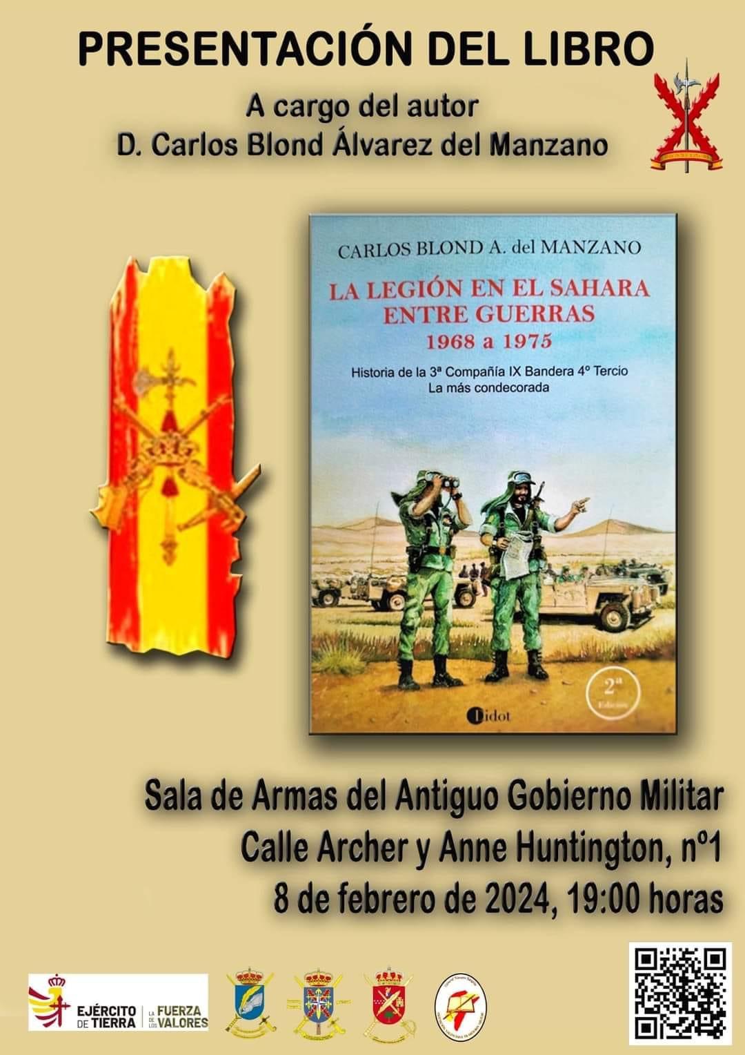 que anuncia la presentación del libro, “La Legión en el Sahara entre guerras, 1968 a 1975”, que será efectuado por su autor, el General de Brigada (R), D. Carlos Blond Álvarez del Manzano, el día 8 de febrero de 2024, a las 19:00 horas, en el salón de Actos de la Sala de Armas del antiguo Gobierno Militar de Valencia, sito en la calle Archer y Anne Huntington, nº 1. Obra cedida a beneficio de la «Fundación Tercio de Extranjeros»