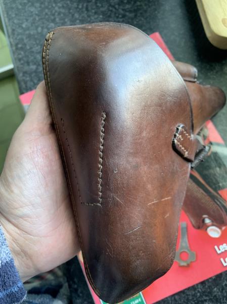 Hola compañeros, vendo funda en color avellana para la pistola alemana Luger P08 en muy buen estado de conservación para sus más de 100 años de antigüedad. En una de las fotos he indicado una zona de 2,5 o 3 centímetros de longitud en donde la costura esta saltada, pero no es apreciable a no ser que la abligues,