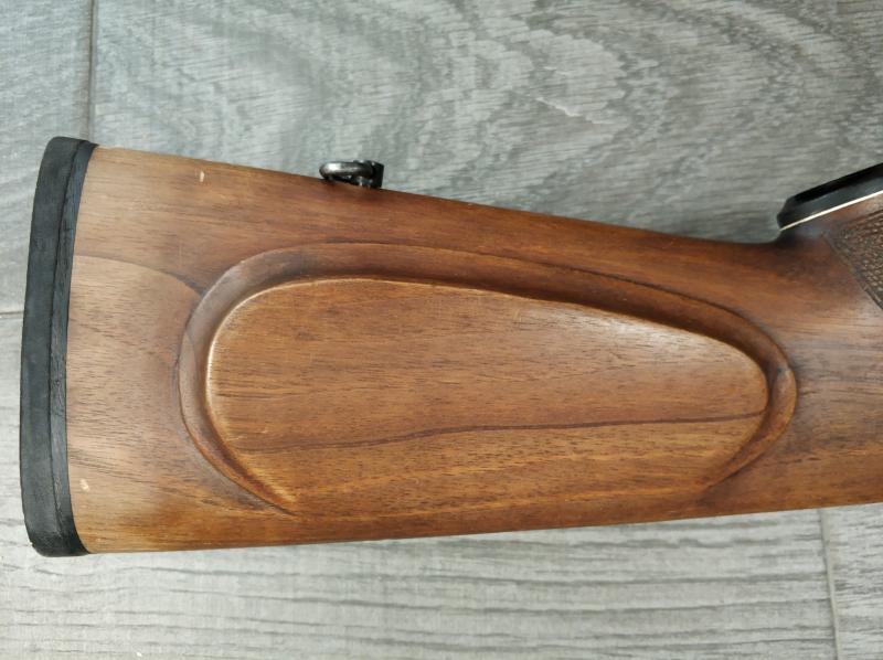 Tiene marcas de uso, y la madera necesita un repaso (ver fotos), pero tiene veta. Le falta el tablón del alza (se lo debieron quitar para montar más bajo el visor).