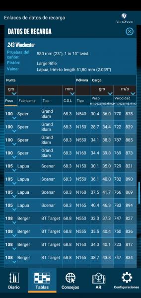 cucal55 escribió:Te adjunto foto de la App de Vithavuori, extrapolando datos podrias sacar una carga para esa punta. Siempre empezando por cargas minimas y ir subiendo de 0.5 grains.
