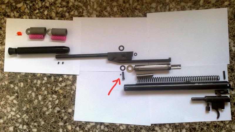 Se refiere a ese tornillo pequeño de la foto que viene señalado con la flecha en rojo. Es un tornillo prisionero que no deja que el otro grande se afloje, y ese es el que hace de bisagra del cañón.