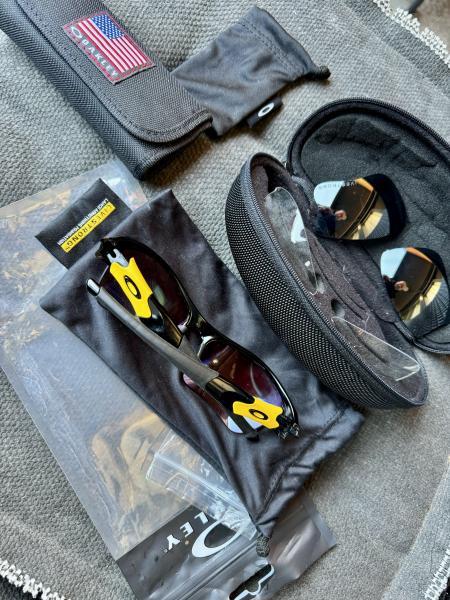 Gafas de sol Oakley Flak jacket jet Black ( 3 juegos de lentes intercambiables) Black iridium / Prizm Trail rosado y otros Clear transparentes.Estuche original rígido tela tipo Kevlar para llevar todo el conjunto + fundas y repuestos de patillas, otros anagramas laterales y soportes nasales y un kit de limpieza y mantenimiento de la marca.