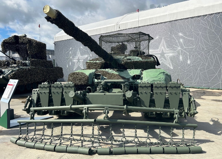 Supongo que ya tendréis noticias de el, pero aquí por si acaso os pongo estas imágenes del nuevo carro de combate ruso T90M para zapadores, el T90 Proxy con el sistema de rodillos AP Arena M para campos de minas. Que por cierto ya salen de fabrica con el paraguas de rejilla anti drones.
