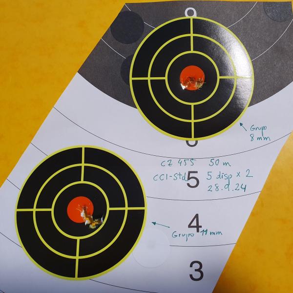 Como de vez en cuando sale el tema recurrente de que "la CCI ya no es lo que era", voy a colgar un par de grupetes que me salieron ayer en el campo de tiro, a 50m con una CZ455 y esta munición, la CCI estándar. No suelo tirarla con esta carabina, si no con la semi, pero como la SK vuelve a escasear...
