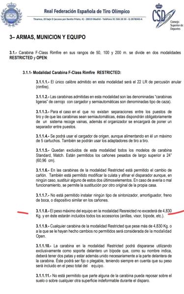 Hola, efectivamente para Restricted el peso máximo es 4'8kg y se usa torreta delantera y saco trasero, pero lo que no sé es el peso máximo de la categoría de la que va este hilo, que es la modalidad Producción, donde se utiliza bípode tipo Harris y sin saco trasero, es low cost y te recomiendo que lo pruebes.