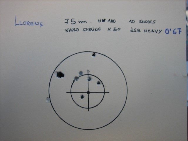 He encontrado esta tirada , que fue un pique con un compañero de Tiro , Llorensan un tipo magnifico !! La cosa es que estábamos muy desequilibrados en cuanto a material . El un Hw100 a 21 Julios con JSB Heavy y un estupendo visor Nikko Stirling Diamond de 50 aumentos , yo por mi parte , un Hw50S de apenas 13,5 Julios equipado con un Hawke Vantage de 16 aumentos y usando JSB exact de 0,51 . Ambos apoyados en mesa con saquete y disparando cada cual a su diana , situada a 75 metros ( medidos con su telemetro ) . Los disparos fueros efectuados simultaneamente , con algo de brisa lateral y este fue el resultado. Juzguen ustedes !!