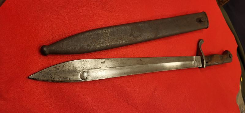 Está en estado totalmente original, con su vaina metálica y sus cachas de madera originales, metales sin restaurar con la pátina y marcas lógicas de tener más de cien años y haber pasado, al menos, dos guerras.