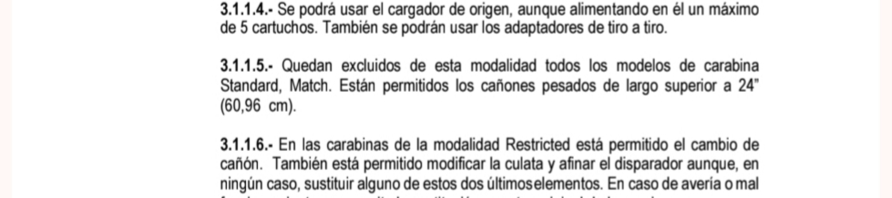 Porque el mismo reglamento también pone que no se admiten las carabinas Standard. ¿Y que es una carabina standard? Podemos decir que una carabina standard podría ser una de serie, sin modificar. Es decir... todas las demás. Es una norma que si se aplica la lógica, se admiten todas las que entren en peso, lleven cargador, y no estén modificadas. Y si nos ponemos a sacar punta al reglamento, habría mucho de lo que discutir.