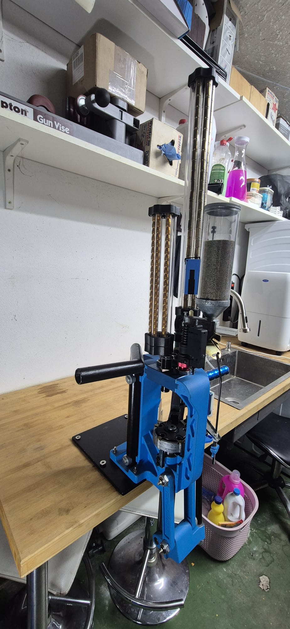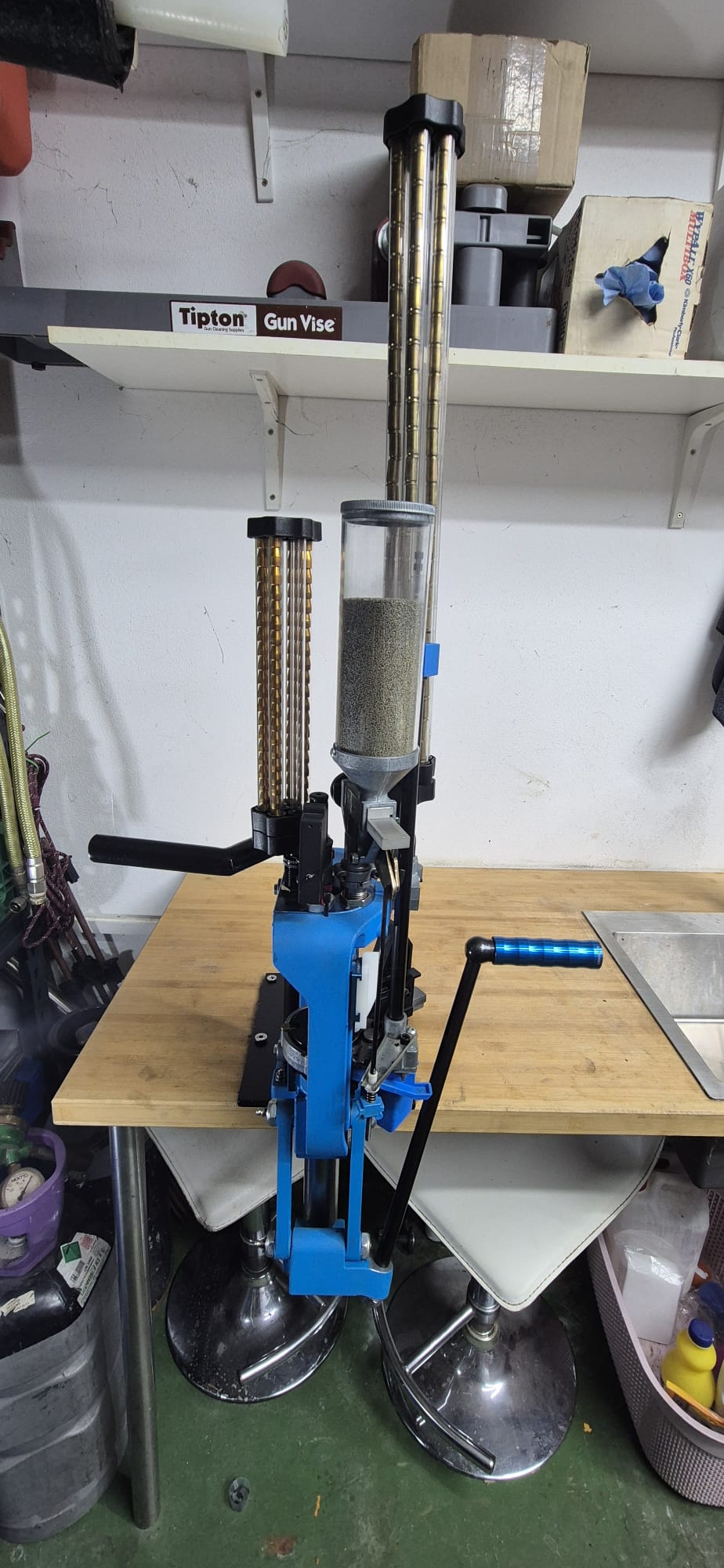 De la marca Armanov : Tiene el interruptor desconector de pistones, cabezal de dies, perilla ajuste micrométrico del dosificador de pólvora, Mango de accionamiento de rodillo con rodamiento de bolas y el bloque de leva con rodamiento de giro.
