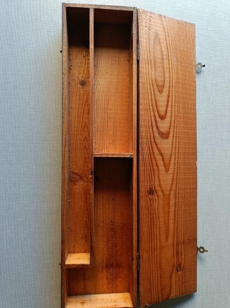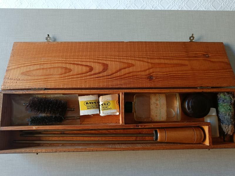 Antiguo estuche en madera de los años 70 para limpieza de armas; etiquetado por la Armería Ravell de Barcelona; la descripción original es que se trata de un equipo de limpieza para armas rayadas de diversos calibres.