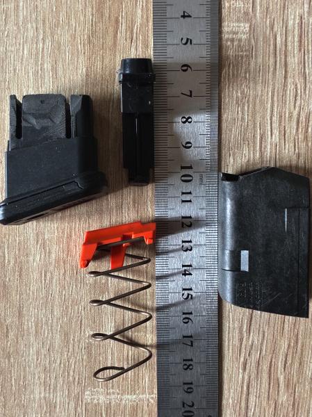 Se desmota moviendo primero la base para desbloquear las pestañas; luego se recorta con sierra de pelo, se lija a medida (por encima de ambas ventanillas indicadoras y las pestañas; la pieza de bloqueo también, por los laterales), se recorta el muelle y se prueba que solo quepan dos cartuchos (y que la longitud sea adecuada para la carabina). Finalmente, se cierra con superglue.