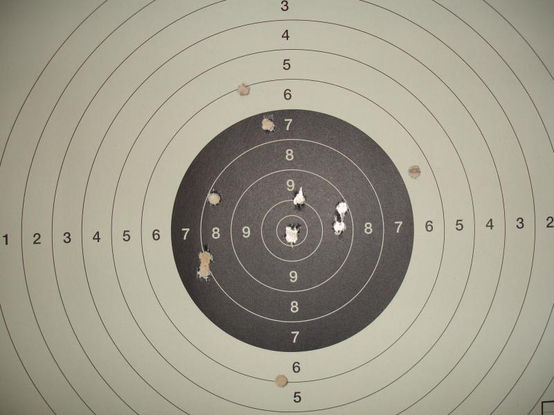 Por fin y a pesar de los disparos efectuados ( tenganse en cuenta los 2,5 kilos de peso del revolver cargado ) con 30 grains de pólvora un casquillo del 357 de sémola y bola de 451 y disparando con una sola mano he quedado gratamente satisfecho al ver el resultado.