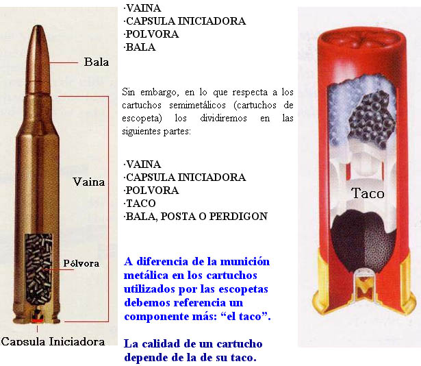 Los perdigones de un cartucho van alojados en un contenedor platico (el taco) que lo que hace es separarlos de la carga de polvora ademas de mantenerlos juntos en su recorrido por el cañon, aparte tambien que el taco hace que la transferencia de energia de la explosion de la polvora sea mas efectiva.