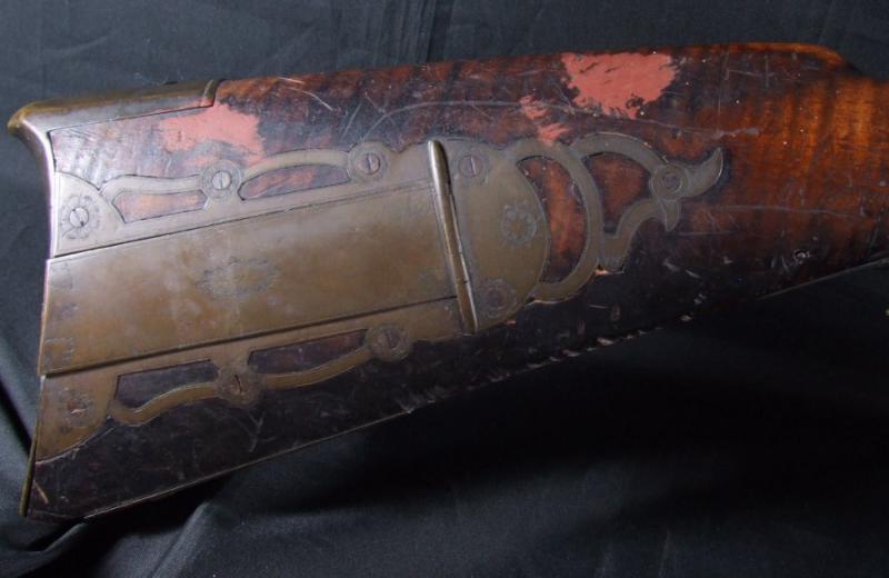 17 Libra Heavy Barrel Flint rifle con M.M. Maslin marcado en la cerradura. A principios de Buffalo Gun. Se reflejan los años de uso prolongado, en piedra original con la culata pesados de ancho, que es una indicación de los primeros fusiles de pedernal. Viene con una tarjeta en patchbox que dice: \ "Esta piedra pesada fusil fue vendido a nosotros por la familia. Ellos originalmente vivían en Bozeman, MT. La familia de quién era el arma fue nombrado Ashland. Gatillo conjunto funcional, con el uso del negro quema de polvo detrás del martillo. En general muy bien. Es muy posible que uno de una pistola tipo, nunca he visto una piedra original de este fusil masiva. Temprana Buffalo Gun.