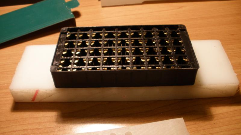 Pues tenemos terminado el dosificador, hechamos polvora, arrastramos con la rasqueta y se llenan todos los taladros, abrimos la compuerta y listo, 50 cartuchos listos para ponerle el plomo.