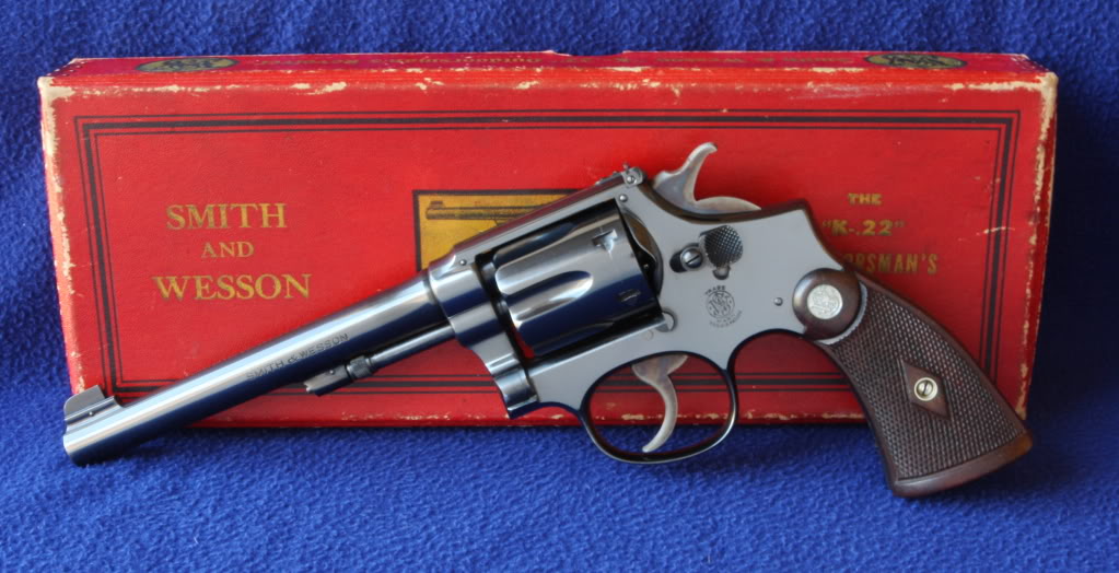Creo que es un K-22 Hand Ejector First Model también llamado K-22 "Outdoorsman" en calibre .22 Long Rifle.