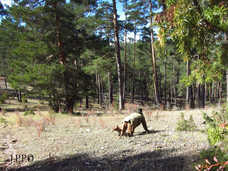 Bueno compañeros, siguiendo con el relato comentaros que la mayor dificultad encontrada como siempre eran las hembras, sobre todo las gamas, siempre con los cinco sentidos alerta, más que el resto, de todas formas algo bien haríamos cuando fuimos capaces de recechar a un machete de gamo a 25 metros o un venado majo a 30. Nuestros tiros fueron desde los 40 metros a los 100 metros, cuestión confirmada por el telemetro del compañero Basajaun, que acostumbra a portar ya que es un coto donde solo caza un reducido número de arqueros y el lo es y de tradicional además. La densidad de bichos es más que aceptable, aunque si se desean resultados óptimos es más recomendable la espera en zonas de paso o el aguardo nocturno, cuestiones estas que en esta ocasión no tocaban y como ya dije el rececho nos da subidón, hasta nos dimos de morros con unas bichas y nos quedamos los seis esperando haber que pasaba...jajaja...Ampliando las fotos veréis algunas gamas y el compi con rececho perruno...jajaja