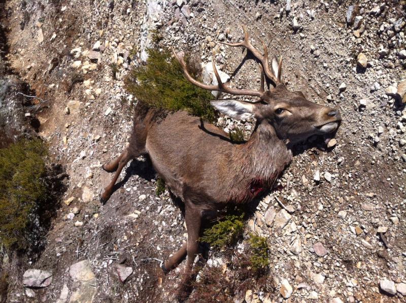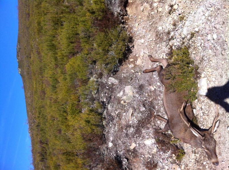Pero mira tú que ayer era el último día de la temporada. A mi amigo está 165 metros a mi izquierda le pasan unos ciervos a 60 metros por su izquierda, o sea, más abajo aún. La vedad es que están más a tiro del que está a dos puestos más abajo de mí, pero como no les tira, mi amigo dispara y echa uno al suelo sin problema y con él ya se conforma y no tira más. Desde mi puesto apenas distingo si son machos o hembras, las cuernas son pequeñas y yo sin las gafas... en fin.