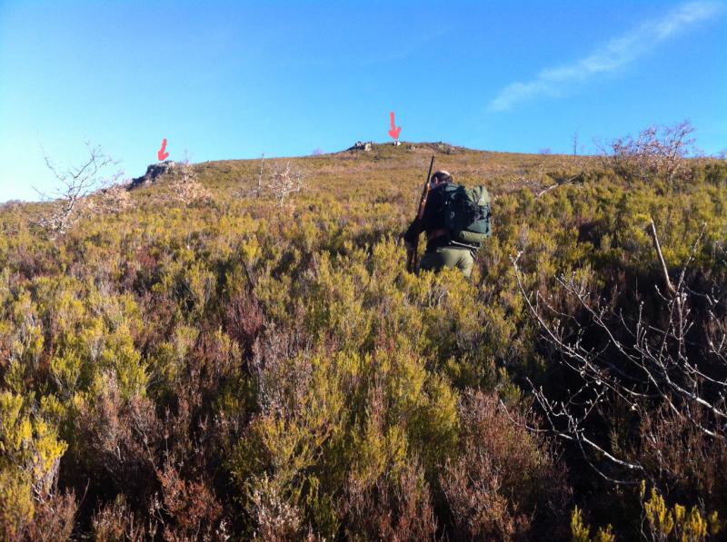 Pues él estaba en el primer risco, yo en el de arriba y los ciervos pasaron a la altura en la que se le ve a él, pero cuando los tiré ya estaban mucho más a la derecha.