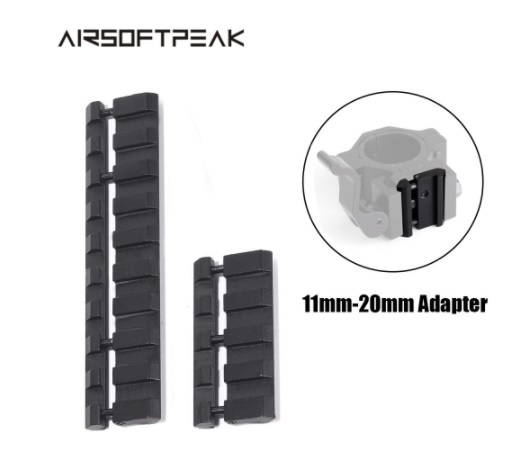 Existen tambèn unos adaptadores de 20 mm a 11mm que se ponen en la parte del visor que va al carril, pero no se que tal pueden funcionar por que los venden para air-soft y ya estamos otra vez con el tema del retroceso.