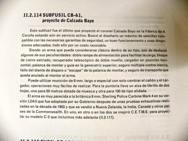 Este es un subfusil experimental Calzada Bayo CB-61 en calibre 9 mm Largo desarrollado a principios de los años 60 en la Fábrica de Armas de La Coruña por su director, el Coronel Calzada Bayo.