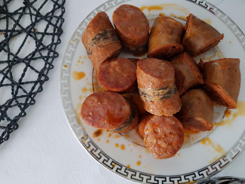 Medallones de rollo de ternera, con centro de foie, en salsa al vino.