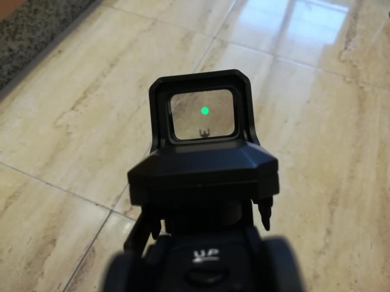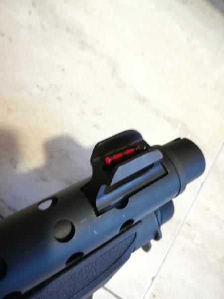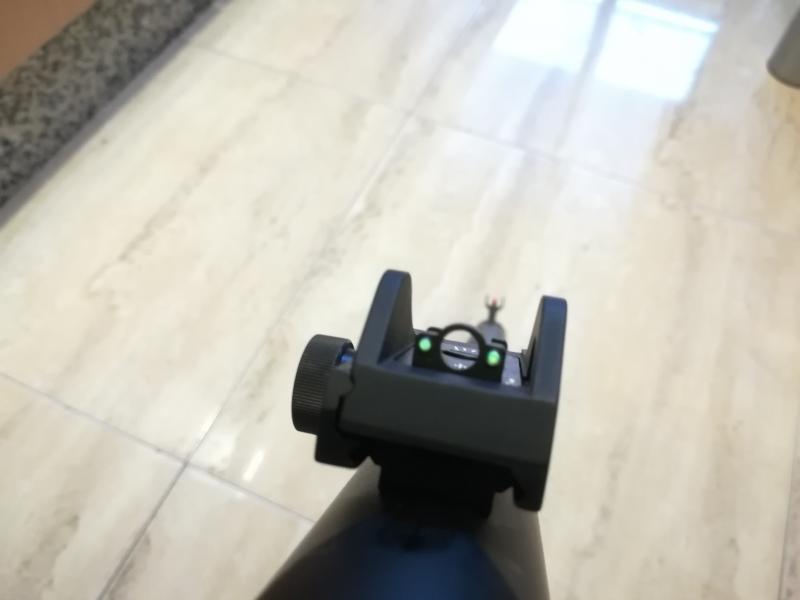 Conjunto de alza y punto de mira de fibra "Ghost Ring" (el alza va directamente colocada en el riel Picatunny; pero colocar el punto de mira exigió de la intervención de un armero, que primero quitó el que traía [de poste, soldado directamente al cañón, por lo que tuvo que limarlo] y después hubo de cortar a la medida el escudo térmico y soldar [mediante microsoldadura] el punto de mira nuevo al cañón).