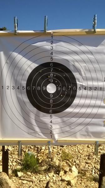 A pesar de lo ATPC que está el jodido blanco, tras unos disparos de aproximación comenzamos a entrar regularmente en él.............. cerrando la serie inicial hasta con dos disparo seguidos dentro del negro (dos cuatros)![]()