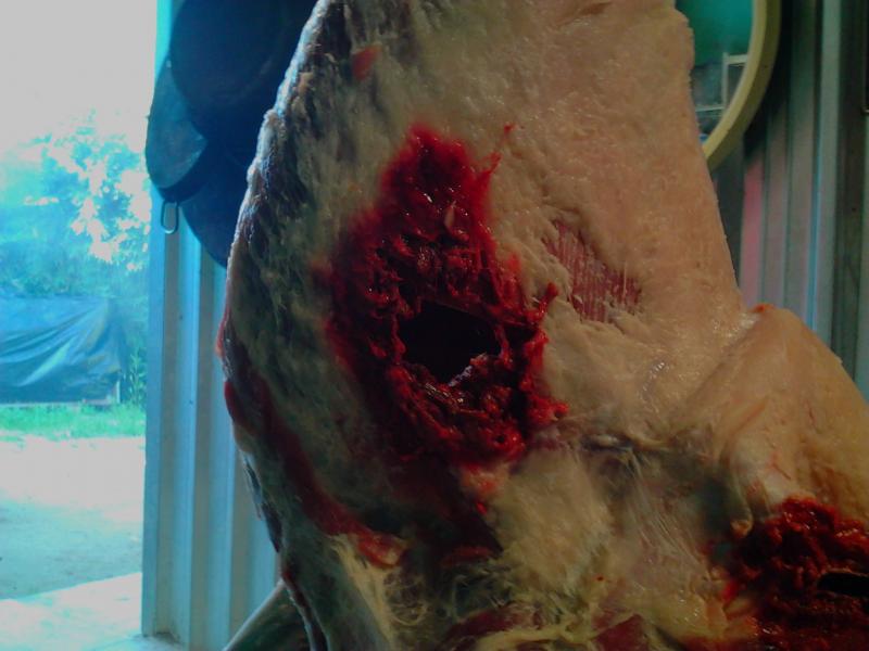 Dicho lo dicho, el fiasco no fue de la municion sino de quien centró el visor, y analizando lo que describes, la res recibió el impacto en las crestas de la columna vertebral cinco centímetros mas abajo y la hubieras partido en dos.