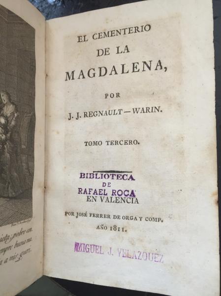 Los 3 tomos titulados "El cementerio de la Magdalena" son de 1811, en unos días recibiré el 4º tomo del mismo año, con lo que completaré la obra, es una novela histórica, sobre la revolución francesa, la toma de la bastilla, etc. En dicho cementerio, que ya no existe, ahora hay un jardín, está enterrado Luis XVI, junto con otros nobles ajusticiados durante la revolución francesa. Lo más interesante es el ex-libris que tiene manuscrito de un ferviente monárquico: