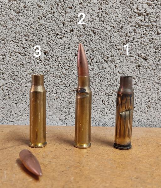 En primer lugar comprobé que efectivamente, el cartucho con punta de 150gr y LTC 72'8 se desmonta por la inercia del cierre (supongo que actúa como un martillo de inercia), pero la bala no queda tan atorada como me pasó con el cartucho (3), de hecho sale por sí sola al inclinar el Cetme.