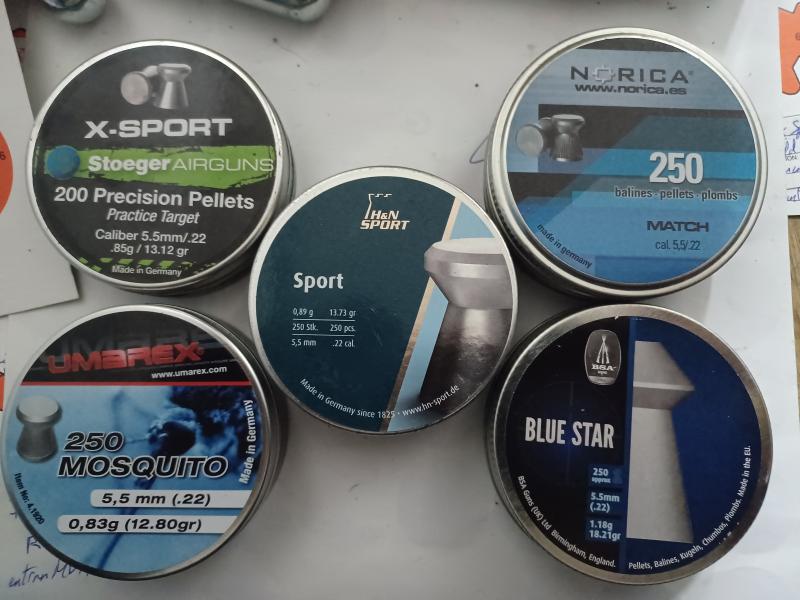 He probado junto Stoeger X-Sport, H&N Sport y BSA Blue Star 2 Match más, los Norica del Decathlon (leí que eran H&N, pero son bastante peor) y Umarex Mosquito (ambos 7€/ud tirados