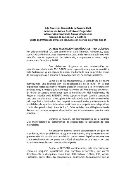 Me acaba de llegar la solicitud de la RFETO que han presentado a la dirección general de la GC reclamando la nulidad de la directiva esta de los rifles para competición.