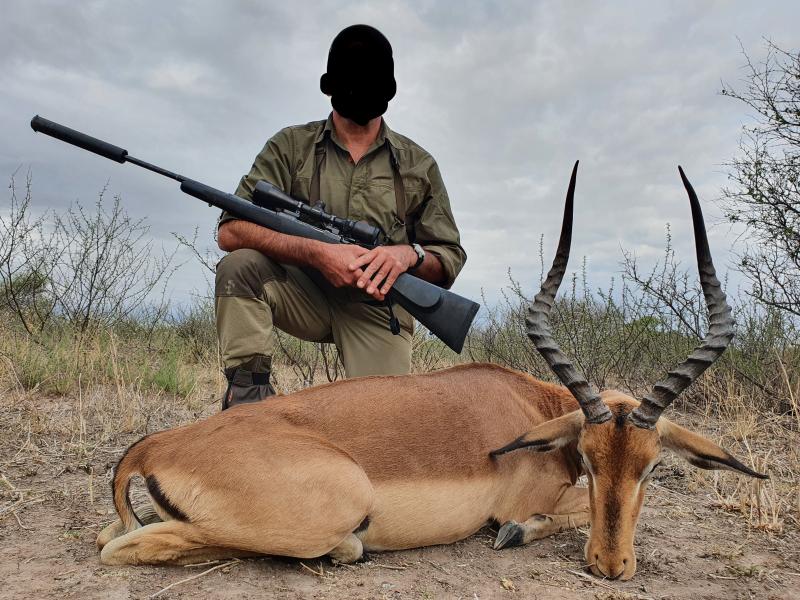 .- Dos facos, una macho y una hembra (macho 9,5 pulgadas y hembra 7,5, sin extraerlos del cráneo). El macho bonito pero la hembra muy bonita. Ambos los receché la misma mañana y en la misma zona. Me ha encantado recechar estos animales. Una gozada. Me quedé con ganas de alguno más pero tras intentarlo un día completo, no hubo forma de dar con un buen macho. No hice esperas, me gustó mucho más ir tras ellos en sus zonas de querencia. El más grande que vimos, me lo espantaron una pareja de hembras de Kudu pese a tener el aire perfecto y el terreno muy bueno para hacerle la entrada....así es aquello...Al macho lo abatí a unos 100 metros. Le disparé en el momento que noté que nos había barruntado...disparo en la frente. A la hembra le hice un acercamiento muy bonito, me puse a unos 15 metros......una gozada de lance.
