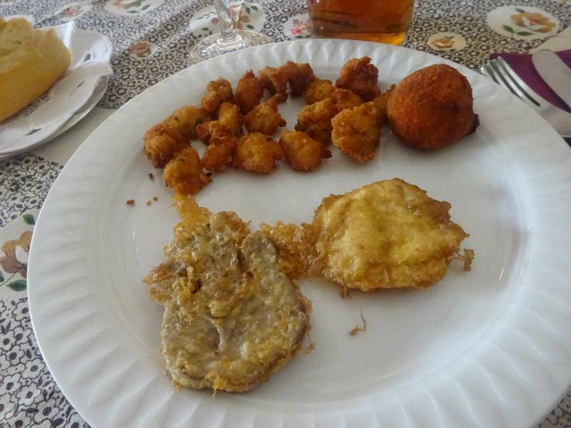 Ahora van los fritos variados, croquetas de jamon, sesos rebozados, lengua idem, fritos de huevo y mollejas.