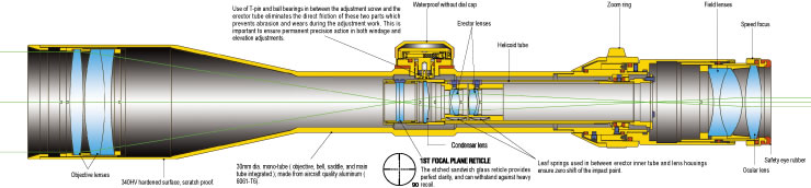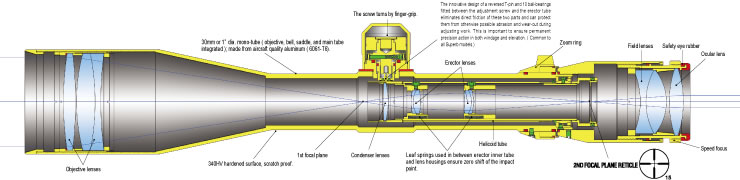 Por lo que si el agrandamiento o magnificación es en todos los planos no va a afectar a las virtudes de la retícula como regla de medir ni al error de paralaje que se corrige con la rueda lateral o de enfoque del primer plano.