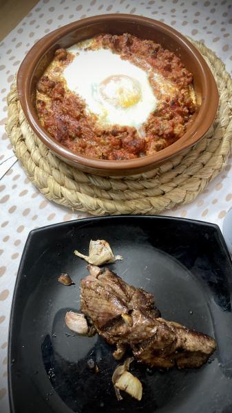 Huevos al plato con bolognesa de jabalí. (Jabali picado, unos tacos de chorizo rehogados, tomate frito natural, el huevo y cinco minutos de horno)