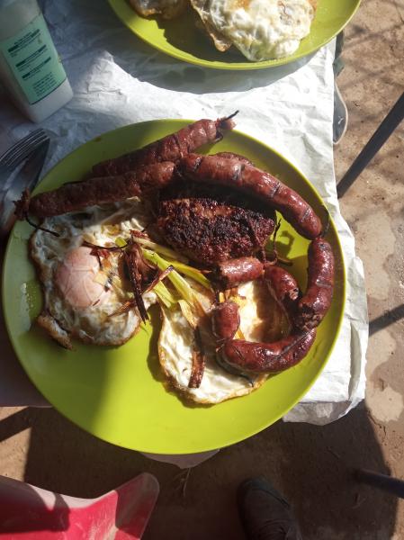 Salchichas frescas y hamburguesas , ambas de corzo a la brasa con sarmiento , huevos fritos de gallinas del corral alimentadas con desperdicio de verduras pan duro y maíz..