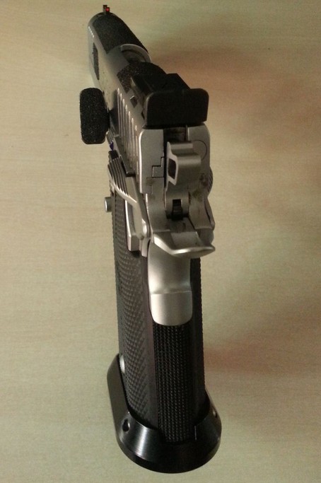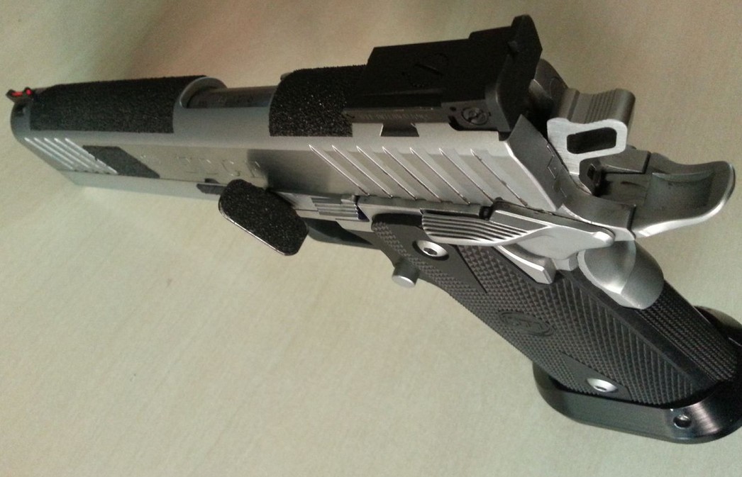 Ahora, la tengo algo mas "custom", ya que le añadí un Thumb Rest algo distinto, y le puse "tripas STI" (desconector, martillo, fiador y aguja percutora), además de la uña extractora Aftec.