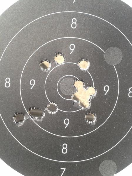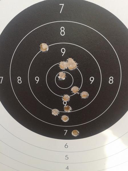 Lo que no me ha cuadrado han sido los tres últimos disparos que se me han ido a la izquierda y ligeramente bajos. La verdad es que estaba tirando en un blanco "sol y sombra" con la sombra en diagonal y puede ser que su avance me haya descolocado.