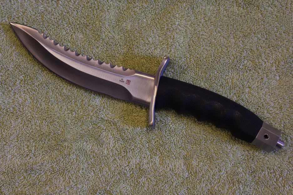 "Una tercera parte del lomo está compuesto por una sierra. No se parece para nada a la típica sierra que conocemos. Más bien se describiría como una más precisa atendiendo a los finos aserramientos triangulares con un doble bisel de geometría angulada. Los biseles angulados podrían servir como rompe-huesos."