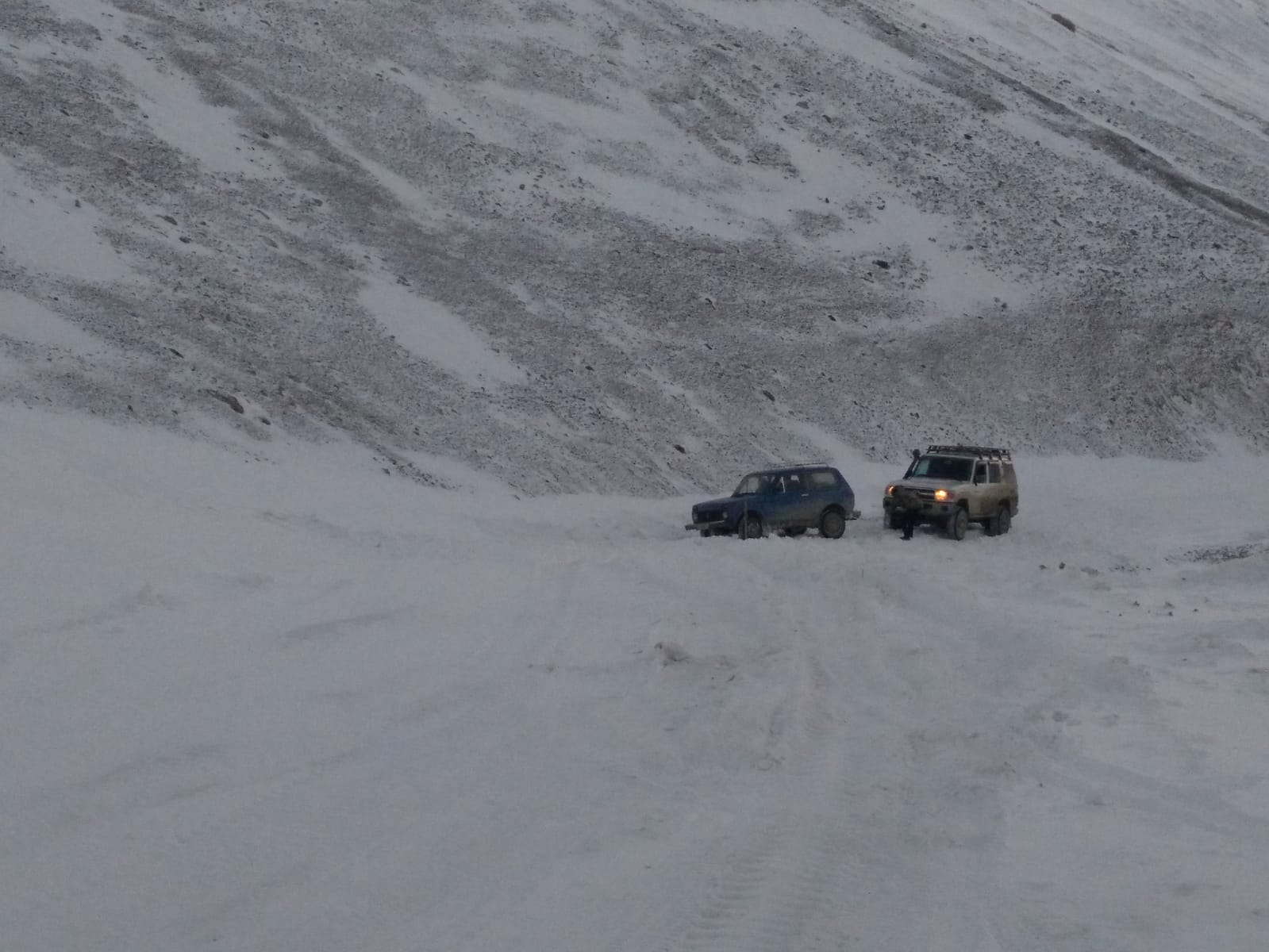 LLevaba unas ruedas muy finas y de tacos , el problema es que era un ventisquero y los bajos del coche tocaban la nieve , con lo que las ruedas quedaban al aire , perdían agarre ...........