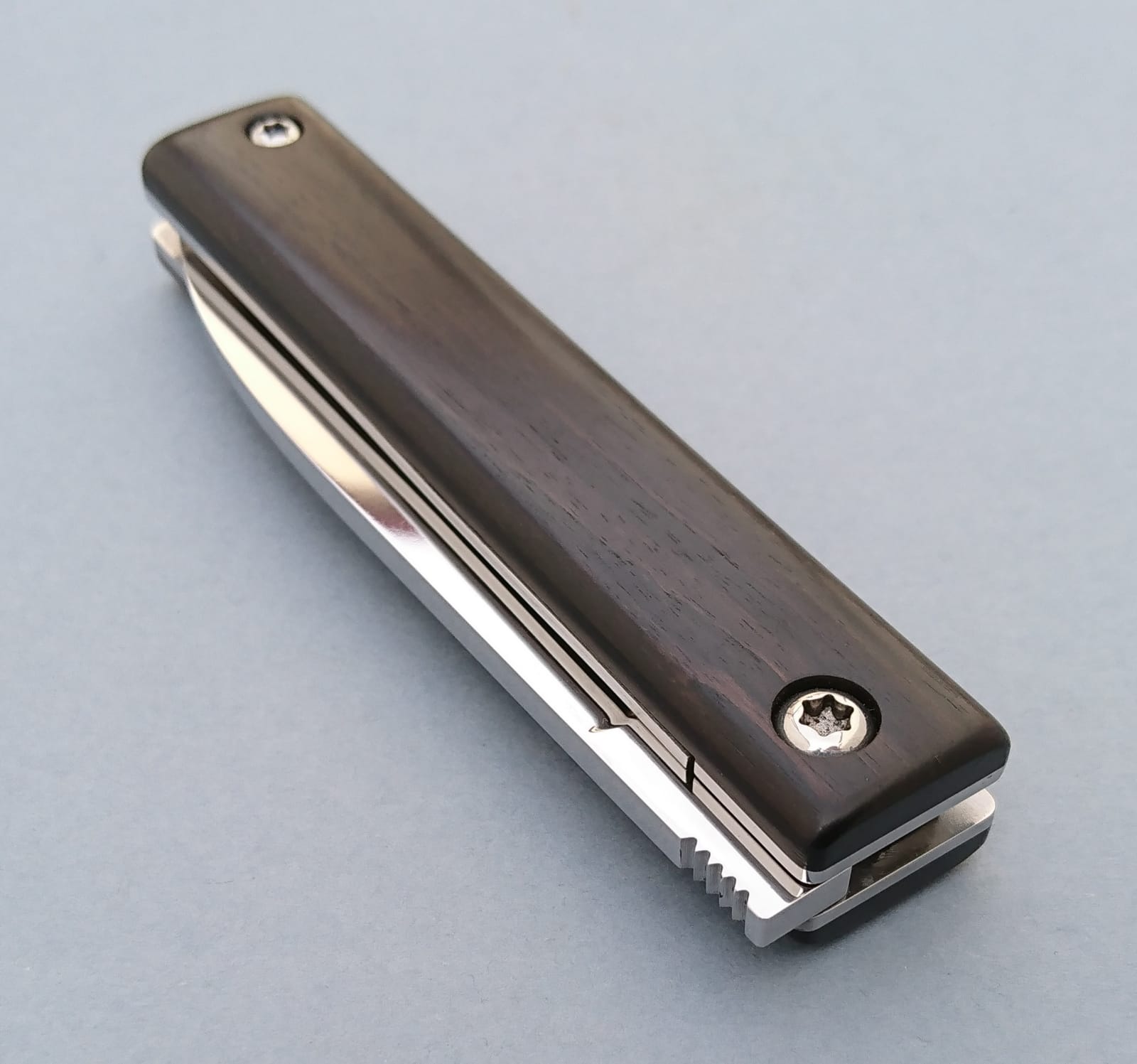 Era una navaja de perfil rectangular, con cachas de madera acanalada a lo largo, hoja de unos 10 cm y apertura con una sola mano si se atornillaba a la hoja un tornillo con cabeza estriada.