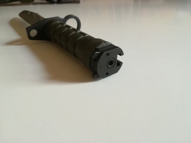 Compañero, claro que leí tu primer mensaje. Empezaba con "Me han regalado un cuchillo de buceo...". Lo que ha cambiado desde entonces es que ahora sabes que no es un cuchillo de buceo, sino una bayoneta. De ahí mi pregunta. Porque yo no estropearía una bayoneta para hacerme un mal cuchillo de buceo.