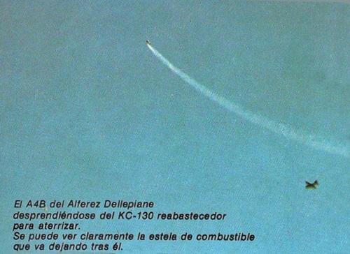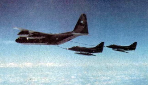 Todo esto del repostaje me ha hecho recordar esta sorprendente acción en la que un A-4 argentino con fugas de combustible a causa del daño provocado por el fuego antiaéreo británico pudo volver al continente ya que estuvo permanente trasvasándole combustible un KC-130.