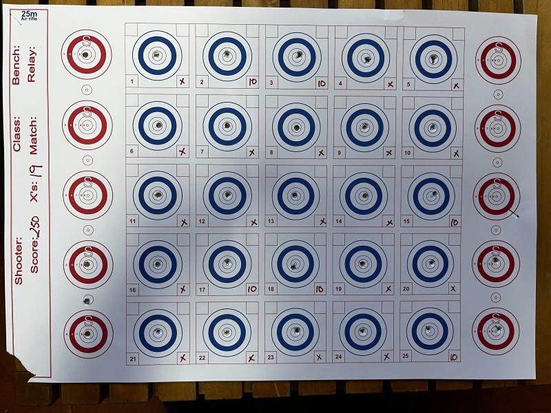 Están bastante bien, aunque sin viento esperaba algo más de X, si que veo que haces pocos tiros en las de prueba, a la mia le gusta mucho que haga 5-7 tiros en la de prueba antes de empezar las dianas buenas, y se nota bastante la diferencia de precisión, por si quieres probarlo