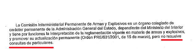 Eso que publicas corresponde al CIPAE (Comisión Interministerial Permanente de Armas y Explosivos) y, efectivamente, no responde a particulares. Pero la ICAE (Intervención Central de Armas y Explosivos) tiene la obligacion de responder, pero como han dicho, centrifuga - o puede centrifugar - la responsabilidad de la respuesta a la IA local.
