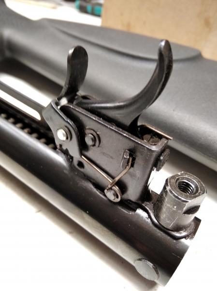 En la 2ª foto se aprecia el muelle que hay encima del tornillo que debería regular el recorrido de los tiempos pero no hace nada, se trata de quitar la grupilla del pasador que hace de eje del gatillo, no hace falta sacar el pasador del todo, si quieres y colocar otro muelle casero mas blando. Respecto al tornillo que creo que es de metrica 2,5 es buscar uno un pelin mas largo para que realmente actue, si se coloca uno demasiado largo puede ocurrir lo que expliqué en el mensaje anterior, no pasa nada si no se aprieta demasiado pero si te pasas de profundidad puedes tener algún problema.